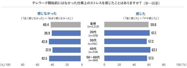 調査によると、回答者の59.6%が「テレワーク前になかったストレスを感じた」と回答。年代別では、20代が58.9%、30代64.6%、40代67.8%、50〜60代が83.6%と、