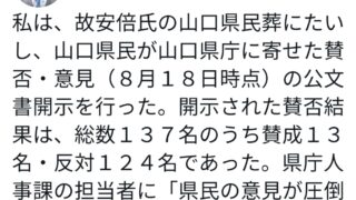 未分類 【悲報】安倍聖帝のお膝元、山口のパブコメで県民葬に9割が反対😭晋さん…どうして… [928380653]