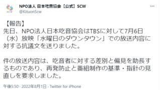 引用元1 ::2022/08/03(水) 09:06:51.99 ID:k8H9EbMN0●.net ?PLT(16931) NPO法人日本吃音協会は『水曜日のダウンタウン(TBS系)』の7月6日の放送内容に対して抗議文を送ったとTw...