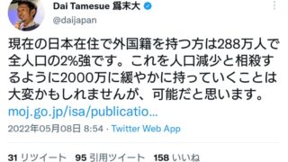 引用元1 ::2022/06/11(土) 10:55:02.82 ID:XTQJepHY0●.net ?2BP(2000) Dai Tamesue 爲末大@daijapan 現在の日本在住で外国籍を持つ方は288万人で全人口の2%強...